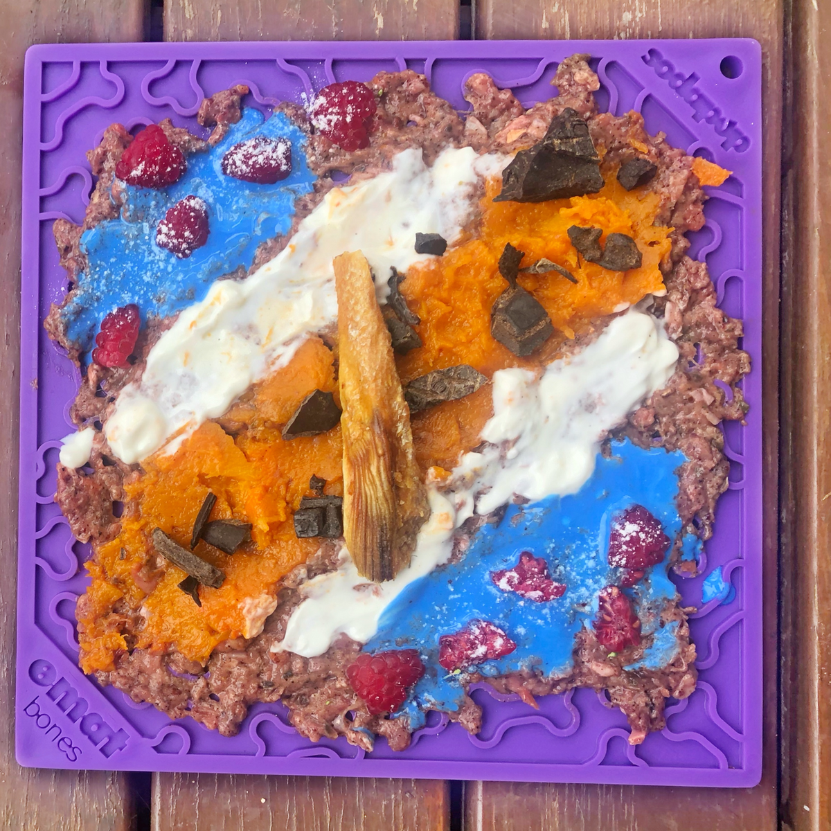 ENRICHMENT: Licking soothes and calms your dog. Spread your dog’s favorite soft treat or raw food across the surface of the emat, ensuring the treat is pushed down into the surface of the mat.