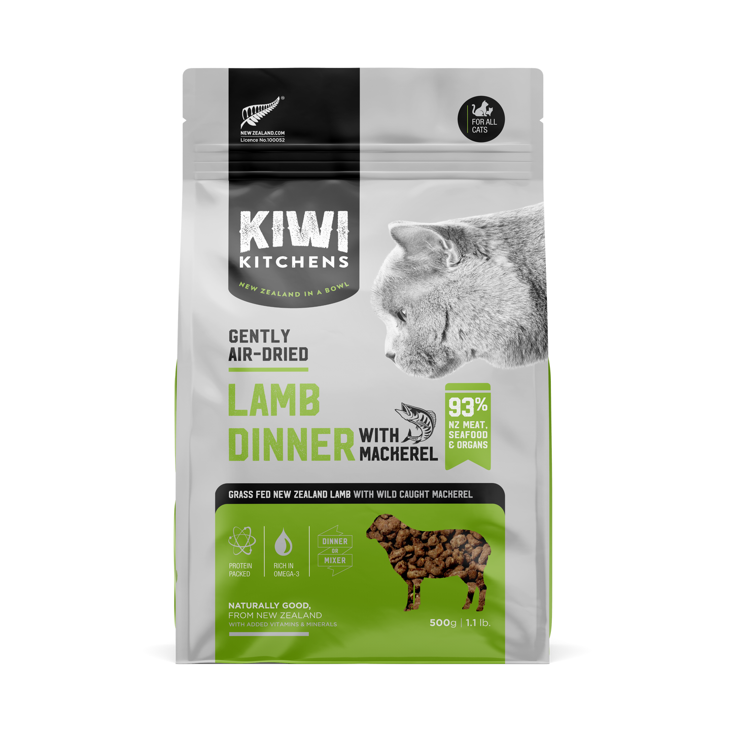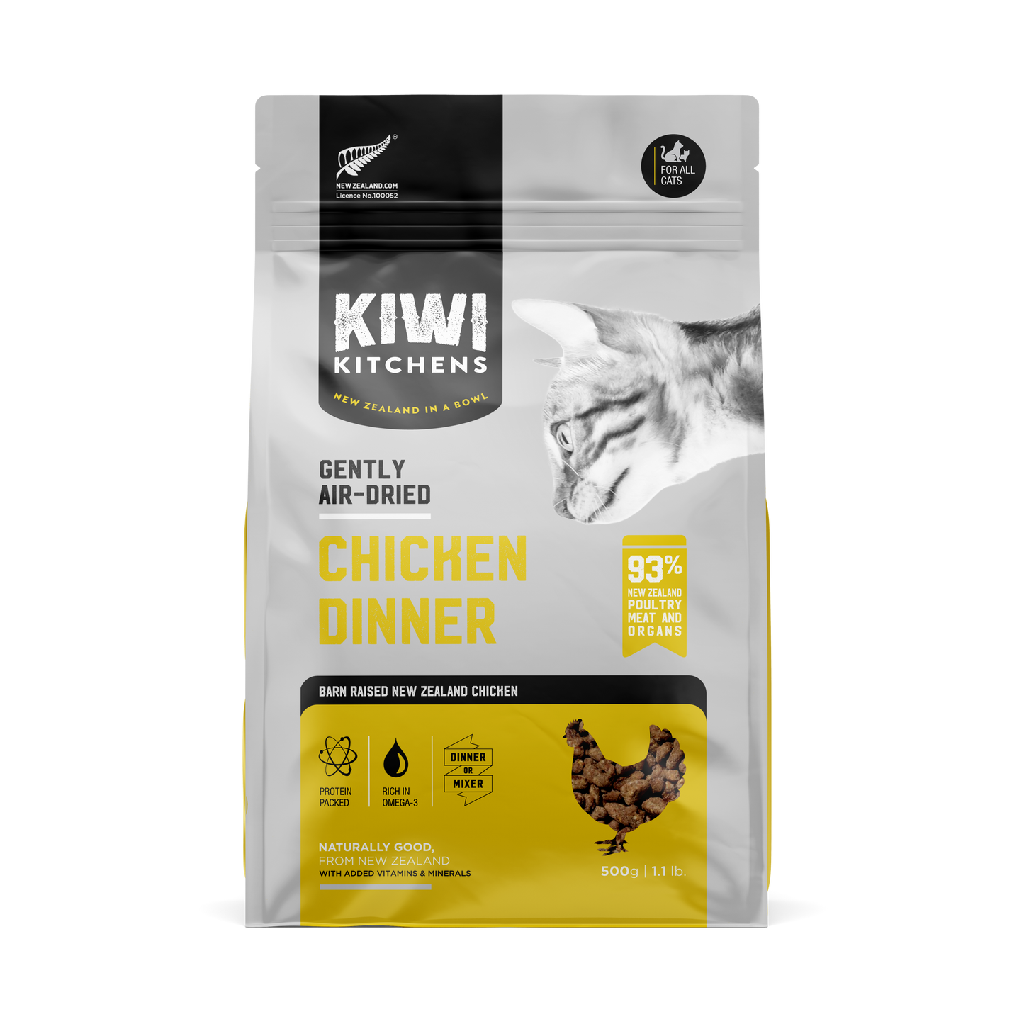 KIWI KITCHENS GENTLY AIR-DRIED CAT FOOD IS A SINGLE AND MULTI PROTEIN RANGE MADE WITH 93% MEAT SOURCED ENTIRELY FROM NEW ZEALAND AND GENTLY AIR DRIED TO LOCK IN NUTRIENTS.