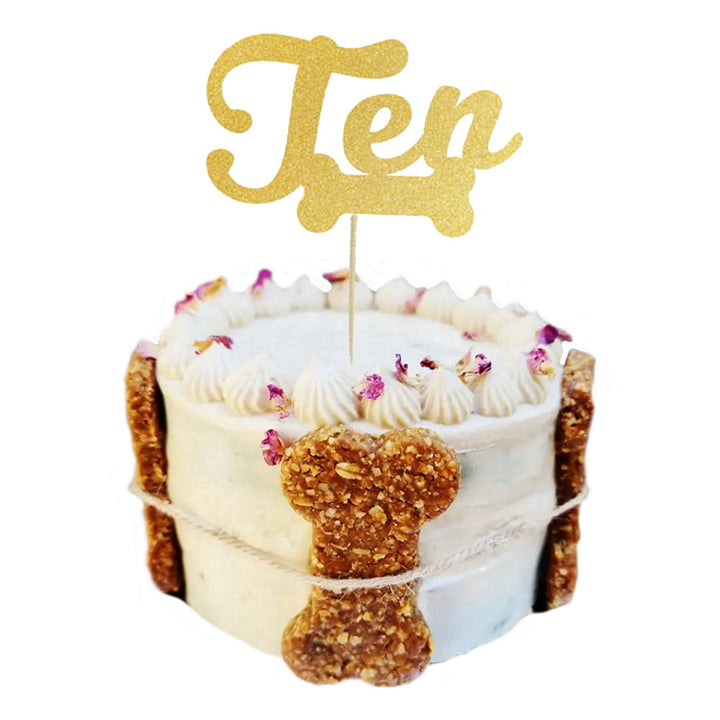 This fun number ten pupcake topper will make a sweet addition to your dog's Birthday cake or cupcake. Made from gold glitter card stock (gold glitter only on front side) attached to a cake stick.